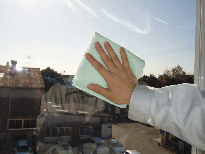 エアープロットは0.08μmの厚みで目に見えない。ガラスがいつも清潔綺麗を保ちます。1年に1回手入れで十分です。